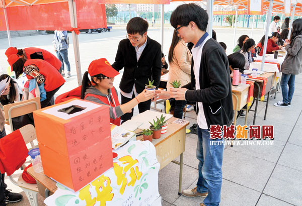 近日,金华持续出现严重雾霾天气,金职院建工学院青大队立即开展了“梦想中国红,绿动金职行”主题的废弃塑料瓶换盆栽环保宣传活动,呼吁大家保护环境。同学们只要凑齐25个塑料瓶便可换取一个盆栽,废弃纽扣电池、充电电池亦可抵相应塑料中瓶。前来换盆栽的同学都在横幅上签字并进行环保宣誓。当天,共有400多人参与到了此次环保宣传活动,共收集约5000个塑料瓶子,送出了200余盆绿色盆栽。