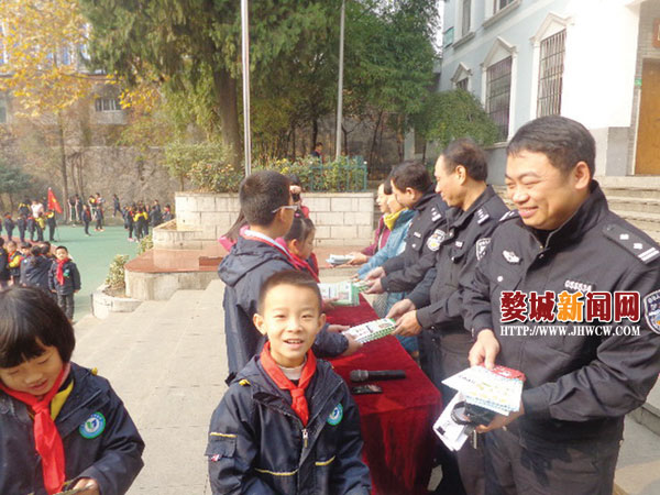12月5日上午,城中派出所、禁毒大队组织民警,在金华师范附属小学开展法制宣传活动,并发放“警民信连心”联系卡和交通治堵宣传卡。