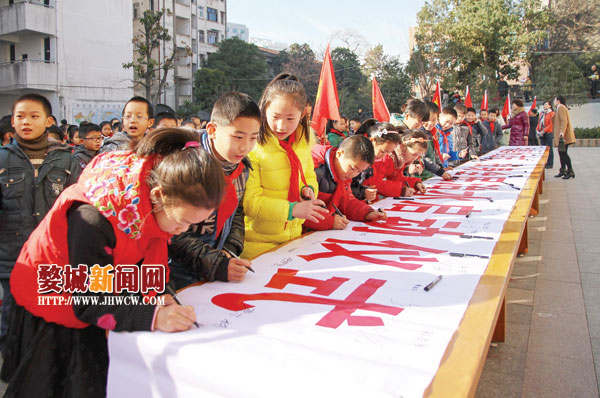 上周五,“共建碧水蓝天、投身全民治水”启动仪式在环城小学举行。“五水共治”是省、市、区政府的重大决策部署,更是关乎我们每一个人切身利益的一件大事,为此,婺城区政府、区教育局向全区59000多名师生发出倡议:争当治水的宣传者、争当治水的实践者、争当治水的监督者、完成一份以“碧水蓝天、全民治水”为主题的寒假作业。