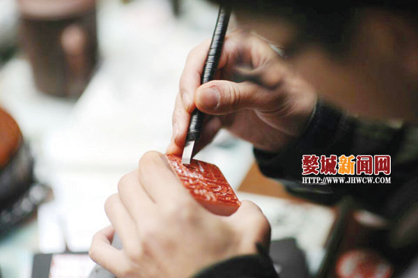 俞晓涛辗转到金华的日子,已经下了决心,要在纂刻这一门手艺里闯出自己的天地。他出身江西上饶,今年二十五岁,正是出来打拼的好时候。自小他就喜好书画,或是出于天性,又受了一位美术老师的影响,在小学、初中,他就是个出黑板报的能手。他的父亲是个渔民,2005年得了癌症过世。“家里的负担一下子重了,我出来学厨师,后来就到了鼓浪屿的一家酒店上班。”俞晓涛说。不想酒店隔壁就是福州大学工艺美术学院,学院里的学生时常到酒店里聚餐,因为他们年纪相仿,也出于俞晓涛烧得一手潮州菜、粤菜,他们也就颇为投合。后来,竟也带他到课堂上旁听,如此两年下来,俞晓涛对书法、纂刻的兴趣陡增,除去上班,多余的时间都耗在练字、刻印上。只要是自己觉得满意的书法作品,他也会张挂在酒店里。直到一位客人看中了他的字,让他写一幅“鼓浪听涛”,酬以两百元礼金,这是他从未想到过的,以致一个晚上都没有睡安稳,“这跟做菜做到麻木完全两样,写字、刻印,越写越精神,越刻越有后劲。”俞晓涛说。