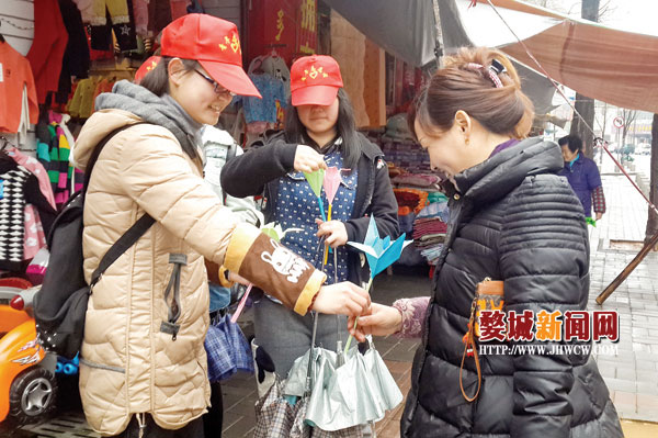 在妇女节的当天,金职院建工学院、农学院组织20余名志愿者冒雨来到婺城区几家社区做感恩活动。活动过程中志愿者们将折好的纸花送给平时为社区环卫工作辛苦付出的妇女阿姨,并为她们佩戴雷锋徽章,鼓励她们传递社会正能量。此外,志愿者们身体力行,沿社区街道进行创卫行动,与社区阿姨一同为金华市的“五水共治”工作出力!