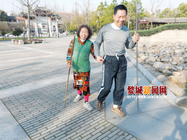 只要没有雨雪,每天早上4点或下午3点左右,市区八咏公园的游步道上,总能看见这么一对特殊的夫妻,一只手拿着拐杖,另一只手紧拉着对方,丈夫走在前面,妻子跟在后面,然后有说有笑,小心而又快步地小跑……这样的场景对于现代的都市人来说,已然是一种难见的温馨。他们是盲人夫妻,男的叫倪根海,女的叫施荷花。他们手拉着手,在这条熟悉而又“陌生”的公园游步道上已经跑了28年。