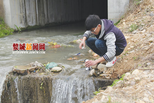 在白沙溪东岸,记者观察到,位于西岸的采样组正在往一大型排污口“迈进”。由于这一排污口体型较大,再加上附近布满了较大的石块,队员前进的速度减慢了。一男生冲在了前头,以较快的速度装满水,在队员们互相之间的“手拉手”中,走上了岸边,朝着下一个排污口前进。