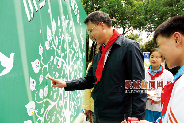 白色大树、蓝色背景、白云、鸽子,一张简简单单的“小手拉大手,携手治‘五水’”的倡议画上,每一张树叶都留下了名字以及按上了红色的大拇指印。胡老师郑重地写上自己的名字,她说:“在签字、按手印的同时,也把‘五水共治’的承诺刻在了心里。”