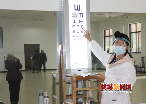 “来,跟我学:闭上左眼,再用左手遮挡左眼;右眼睁开,看着视力表,右手‘告诉’我,口子朝哪边。对,就是这样,老人家真聪明!”在物理检查场地,金医生正耐心地指导郑玉凤做视力检查。