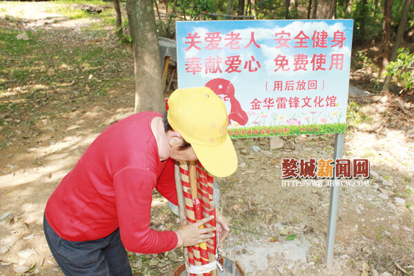 陈金香说,去年10月1日,镇上对尖峰山脚进行了全面的改造,石板路,水泥台阶、凉亭都是新修的,焕然一新的山脚还竖起了一块雷锋牌,上面写着“关爱老人,安全健身,奉献爱心,免费使用”的标语,提醒每一位游客妥善使用爱心拐杖,记得归还。有了这一宣传板的作用,令她的工作轻松不少。