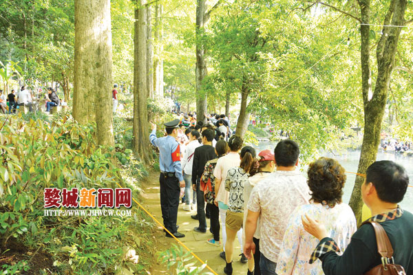 五一小长假期间,婺城公安分局派了120余名警力在双龙景区维护秩序,保障游客安全。