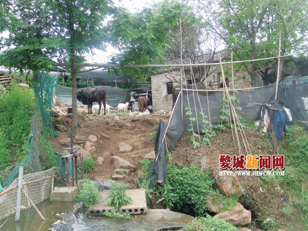 接力塘位于二环北路以北,记者从西南角的小路向东走,首先看到的是塘角漂浮着各种污物,如塑料袋、纸杯等,从岸边延伸至水中,形成一处卫生死角。同时,该塘西侧的平房背面,几根粗细不一的白色污水管,直插塘中。在西北侧,建筑垃圾堆成了小山;东北侧则是一处苗木大棚,破碎的花盆随意倾倒在塘边,甚至塘内,已形成一定规模。再往东看,对面小坡上有一家养殖场,栏舍外拴着两头牛、三四只羊,也有鸡在期间走动。还有养殖场南面,几间板房下方正是回溪河道,半空处堆着一些废弃物,如塑料薄膜、塑料花盆、遮荫网等等。