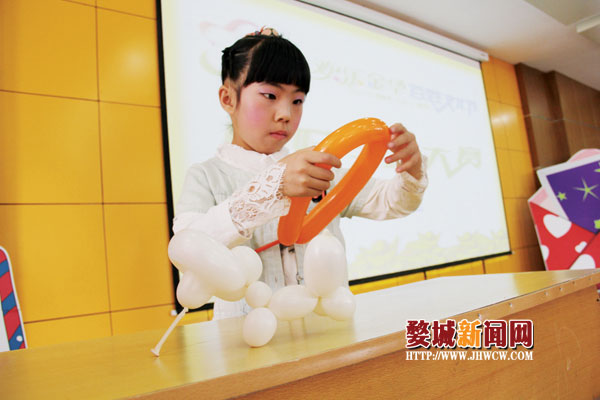 白龙桥小学杨骐宁携手婺城小学郑欣艺,共同上台演出,一位用气球扎出不同的造型,一位演唱着《幸福宝贝》。打气、捏气球、摆造型,只见杨骐宁用灵巧的双手捏出了一个小狗。为了节约时间,亲友团成员倪姨妈还上台帮忙给气球打气。