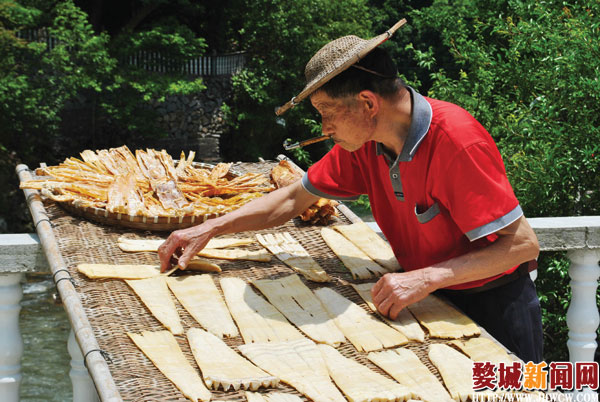 5月,阳光灿烂,正是晒笋干的好时节。昨天,记者在沙畈乡小羊坑村看到,75岁老人华青林正在家门口晾晒笋干。老人时不时翻一下竹匾上的笋干,神情悠闲又满足。他告诉记者:“今年笋干价格好,上门收购的人也多。这不,前几天让我卖了个高价———15元一公斤。看来,今年收入肯定能比去年好。”