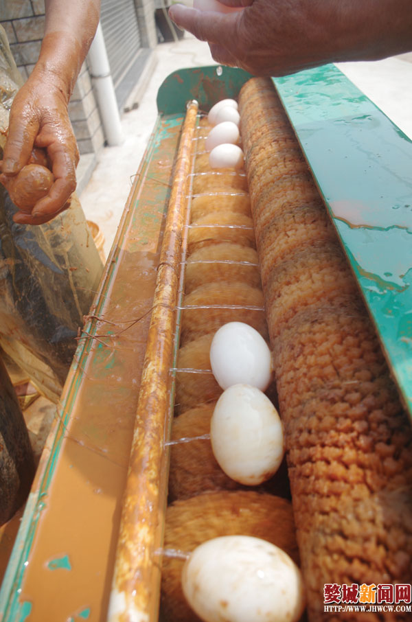 左边一根喷着几股细流的塑料管;右边一个滚动的粗海绵滚筒;中间一排沾满黄泥的鸭蛋,鸭蛋在底下一个个滚筒的作用下,轻盈跃动……几秒钟时间,一只只白中带青的干净鸭蛋就出现了。日前,记者在婺城区新狮街道勤俭社区看到了这个洗蛋“神器”。