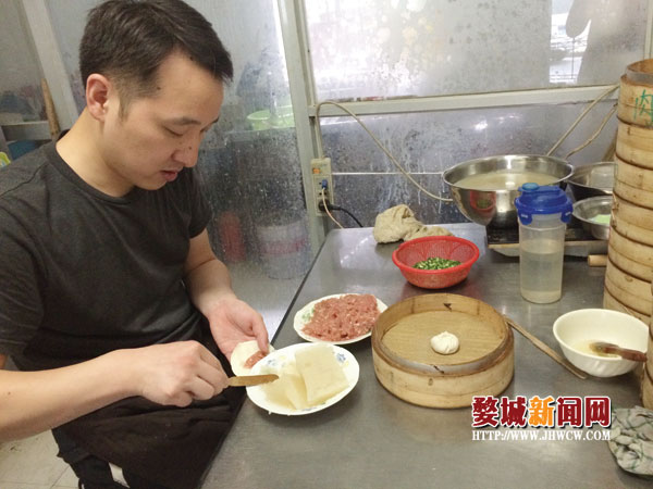 到了下午两点左右,中午最后一波客人离开,传说中的吴师傅终于从厨房走出来吃饭。吴师傅名叫吴炜,今年36岁,虽然忙了一早上,但他看起来精神饱满,一边吃饭一边跟记者聊起来。吴炜父亲吴金中在金华餐饮界摸爬滚打半辈子,金华传统小吃可以说样样拿手。耳濡目染之下,吴炜刚会蹒跚学步就能擀皮。年轻时,吴炜在公交公司工作过,还做过室内设计,后来他决定专心跟着父亲做汤包。