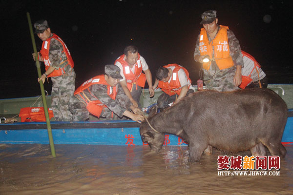 6月22日下午17时许,在白沙溪与金华江交汇处、距防洪岸200多米的一个凸起的小沙包上有一群牛被困在洪水中。前来救援的区人武部应急分队和白龙桥镇干部对牛进行施救工作,直至到了夜里12时30分,终于把被困的16头牛全部安全转移。