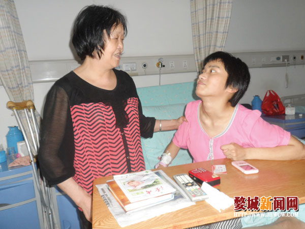 记者发现,女孩身边并无亲人照顾,陪伴她的只有桌子上一台破旧收音机、一部手机、一本《读者》和一份报纸。“虽然行动不便,但小女孩很好学。”一旁照顾自家亲属的朱阿姨说。记者了解到,女孩外婆前段时间来照顾过,但由于年老病弱,后来就回去了。女孩有几个姑姑,可家里条件都不好,迫于生活压力,也不能经常来照顾她。“女孩生活基本不能自理,我也帮她倒水、打饭,有时也扶着她来回走走,多少帮衬点。”好心的朱阿姨表示。