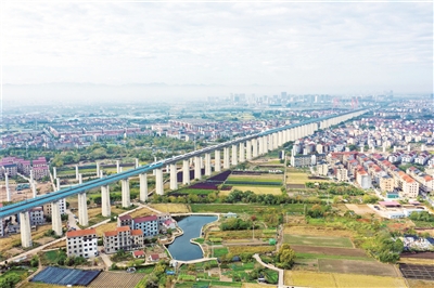 近日,在婺城区乾西乡下天师村附近,高速列车从村庄上空飞驰而过,与田园、村庄民居、纵横交错的路网辉映成景,构成一幅美丽的乡村画卷。