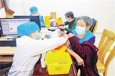 近日,记者在婺城区人民医院疫苗接种点看到,前来接种新冠疫苗的市民络绎不绝,不少老年人在家人的陪同下前来接种疫苗,大家依次排队等候,现场井然有序。据悉,疫苗接种配合有效的个人防护,是当前新冠肺炎疫情防控的有效手段,老年人接种新冠疫苗,可有效降低感染后的重症风险。