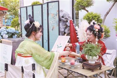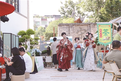 活动主办方还在其中设计了打卡游园换礼品的环节,一位位身着宋制汉服的小姐姐成了大家打卡盖章的服务大使,也成了此次活动中一道亮丽的风景线。人们游园拍照,赏古城美景,看非遗文化,一转角,于灯火阑珊处邂逅古装美人,仿佛穿越千年。金华职业技术学院大一学生姜圆圆就是参与此次活动的工作人员之一。古城墙边,她一袭素色汉服,头挽宋时女子的发式,穿梭于人潮之中,成为不少镜头拍摄的焦点。她告诉记者,这既是一场社会实践活动,也是一次宋韵文化的有趣体验。在这场活动中,有宋制斗茶,有宋式团扇,还有各色非遗文化,让她对中国传统文化有了更丰富的理解。
