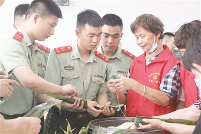 在端午节来临之际,婺城区城中街道杨思岭社区马奶奶拥军服务队与武警金华支队勤务保障大队警勤中队官兵一起包粽子,现场一派军爱民、民拥军,军民团结一家亲的浓厚氛围。长期以来,武警金华支队勤务保障大队警勤中队一直与杨思岭社区开展军民共建活动,建立了深厚的鱼水情谊。