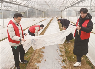 在婺城区蒋堂镇胡家村草莓种植大棚,由该镇党员干部组成的志愿者分队,帮助农户清扫大棚上的积雪,及时为棚内草莓覆盖保温膜。“一早,我们集中组织了3支党员服务队,对重点农业种植户进行帮扶。”蒋堂镇相关负责人说,该镇各联村干部、网格员全部到村和田间地头,收集农户信息,组织力量开展帮扶。