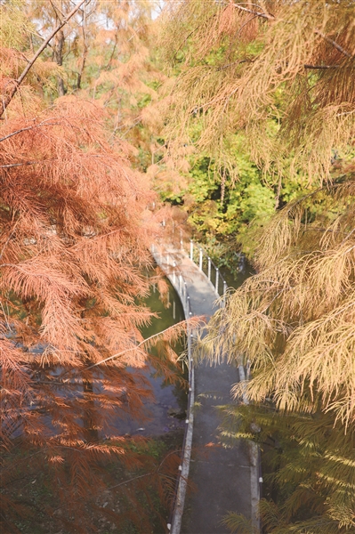 若说婺城的初冬有什么不可错过的风景,那一定少不了杉树。依水而立的水杉,点亮公园的落羽杉……颜色从青绿渐转为锈红,不是一夜骤变,而是一日一染,直至凝成一整片温厚而沉默的“棠梨褐”。