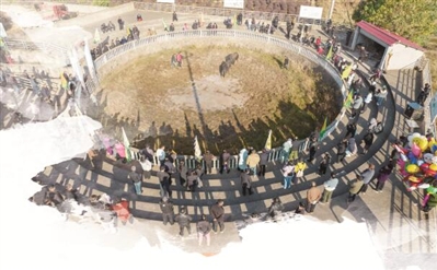 12月15日上午,金华市婺城区雅畈镇铜山村斗牛场中,看斗牛的群众已围了两圈。当天是农历十月廿六,是金华斗牛比赛的传统日子。现场观赛的不仅有附近几个村的村民、驱车赶来的城里人,还有浙江师范大学的中国学生和外国留学生。