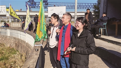 记者陆欣(前排右)、张苗(前排左)与何建民(前排中)一同现场解说